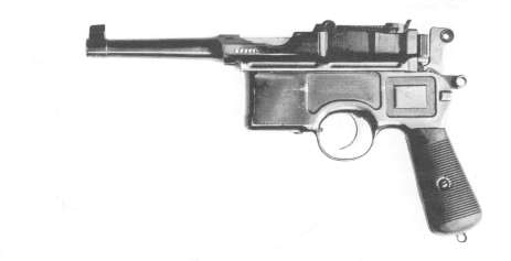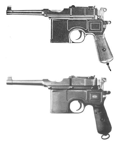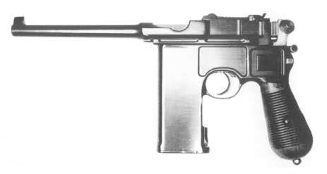 Postwar Bolos After the Armistice, the Allies imposed restrictions on German arms production. Handguns were limited in barrel length and caliber. Mauser began producing new pistols again in the early 1920s. The standard Mauser 7.63 mm caliber was apparently in compliance with Allied demands, but the 5.5" barrel was too long. Instead of making guns identical to their prewar or wartime commercials but with shorter barrels, Mauser essentially put their prewar Bolo back into production. This postwar Bolo was the standard C-96 made by Mauser through the 1920s. It was superceded by the M-30 in 1930. The M-30 reverted to the long barrel and full-sized grips. The commercial production postwar Bolos have serial numbers from around 444,000 to 794,000. Around number 500,000 a MAUSER banner mark was added to the left side of the frame. Here are the other differences between the prewar and postwar Bolos -