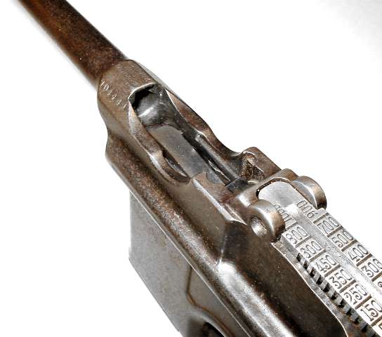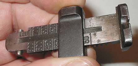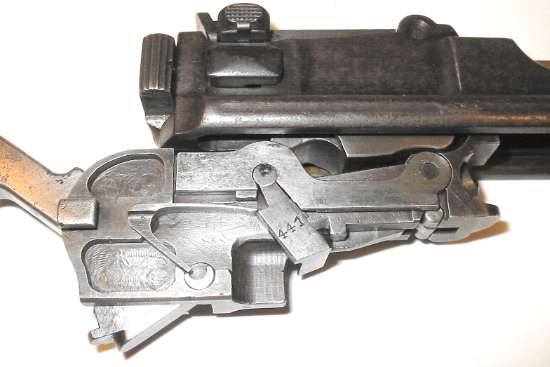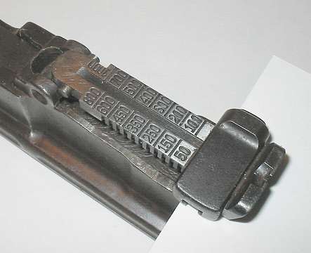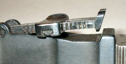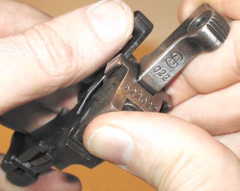 Here he is, on his back and defenseless. Note that some sight leaves, such as the one shown, are serial numbered to the gun (022 barely visible in the photo), but many aren't.