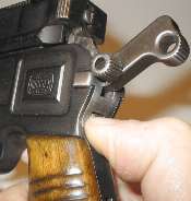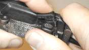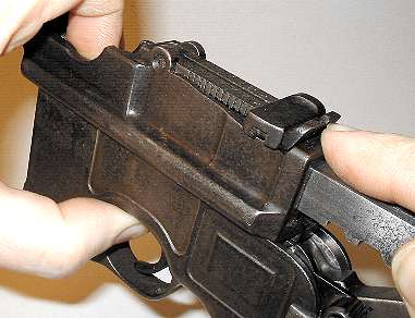 Push up on the takedown latch. The hammer must be cocked as shown. When the hammer is down, it locks the takedown latch down - a thoughtful safety feature to ensure that the gun doesn't disassemble itself when fired. Sometimes the latch is hard to push up and takes a bit more than thumbnail pressure. This one happens to work easily.
