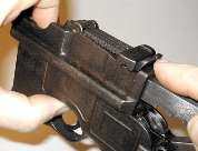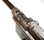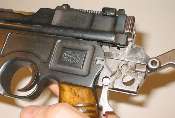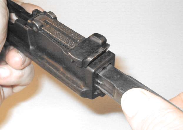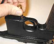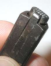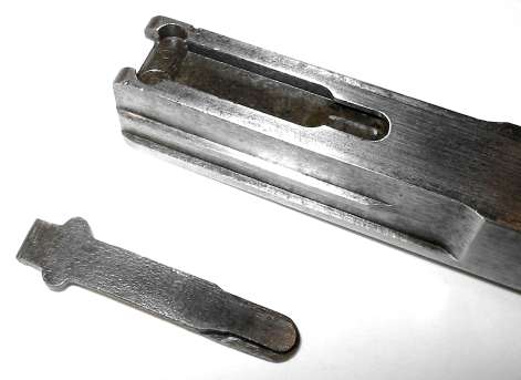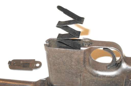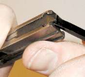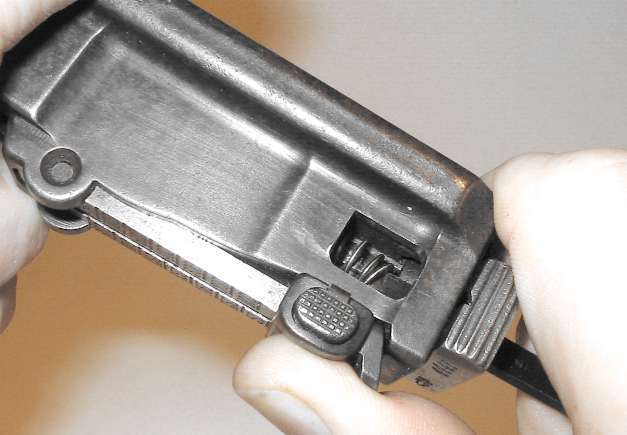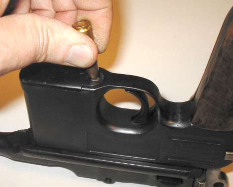 Push in the floorplate catch. Slide the floorplate forward slightly to remove. As shown, a suitable tool for pushing in the floorplate catch is a bullet (that's the Mauser factory's idea, not mine). The cartridge follower and magazine spring will, ideally, come out with the floorplate.