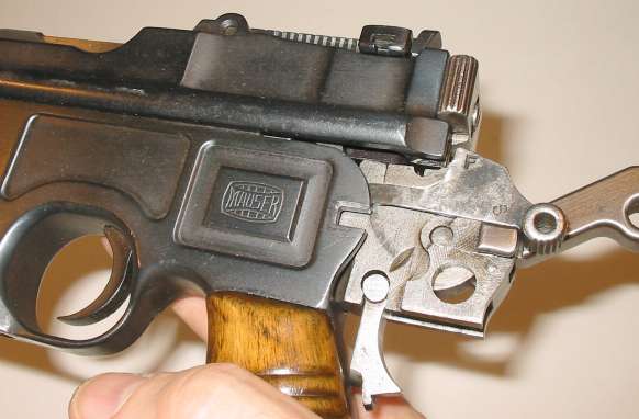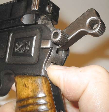 If the gun has the New Safety (standard on guns made between about the start of World War One and 1930), the hammer must be pulled back a bit past the full cock position before the safety lever can be moved. Guns with the New Safety are invariably marked with an intertwined NS monogram on the back of the hammer.