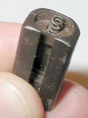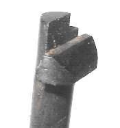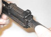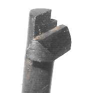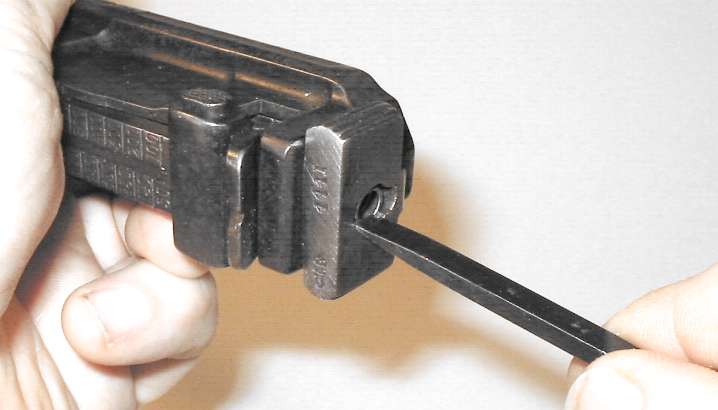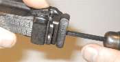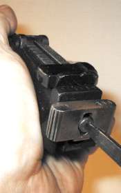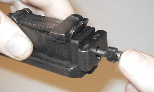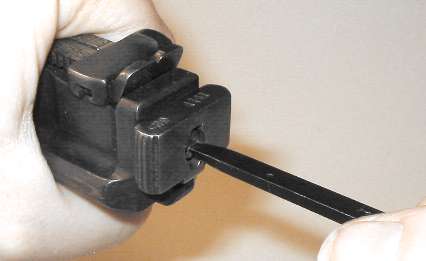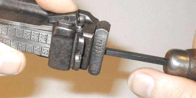 The proper tool shape is much like a flatblade screwdriver, but rounded. The Mauser factory takedown tool/cleaning rod combo has the right shape. Lacking the takedown tool, use either an old screwdriver with a blade which has worn a bit rounded, or a screwdriver with a narrow blade. In the photo I am using a screwdriver which was issued with the Soviet Nagant pistol, which has a blade not much more than 1/8" wide.