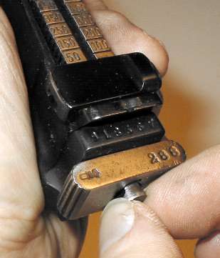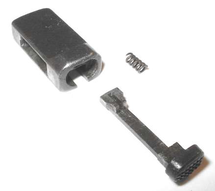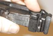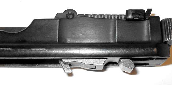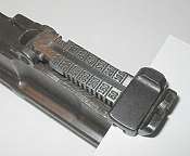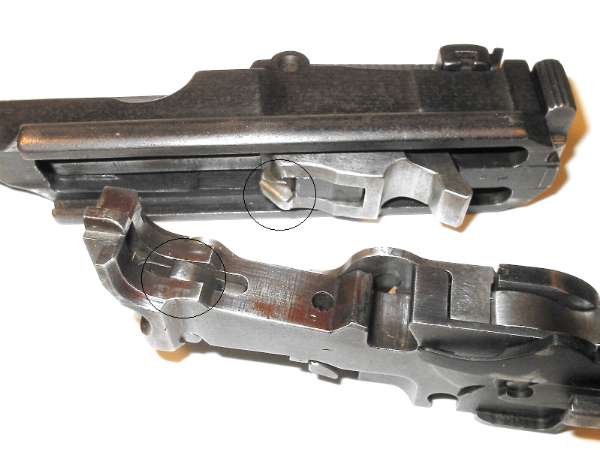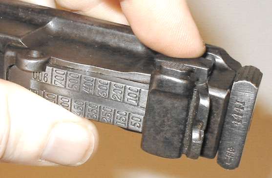 Refinished pistols have sometimes had the sight slide reinstalled backwards. The button should be to the right, as shown here.