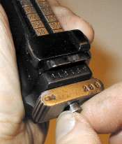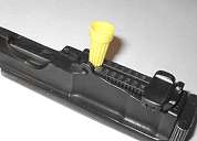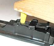Put the barrel extension near the edge of the table or workbench. Set the sight leaf on top of the barrel extension. Put something under the aft end so that it doesn't scratch the finish on the barrel extension as you wrestle it into place. Here I'm using an index card.