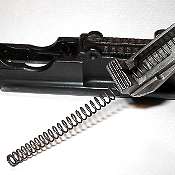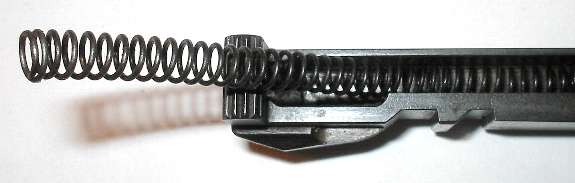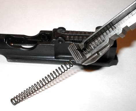 Put in the recoil spring. If your spring has one square end and one cut end, put the cut end into the bolt first. You don't want the cut end resting on the bolt stop if you can avoid it, as the loose end of the wire tends to snag in the bolt stop, making it harder to remove the next time the gun is stripped.