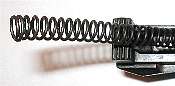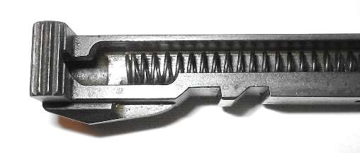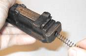 A spring which has taken a set is not only too short, but may be too wide as well. As the spring is compressed the coils increase slightly in diameter. They may have increased too much to fit out the hole in the back of the bolt. In that case, pull the spring out like so.