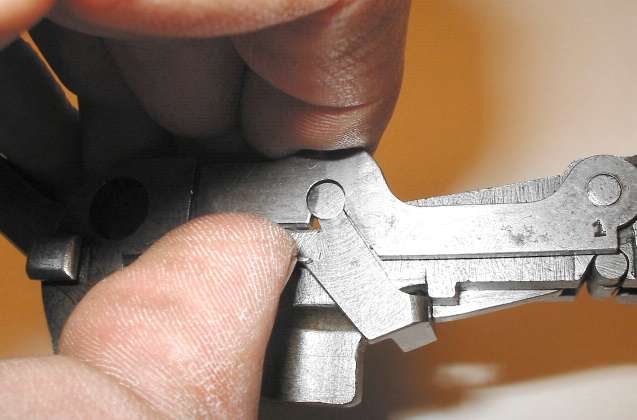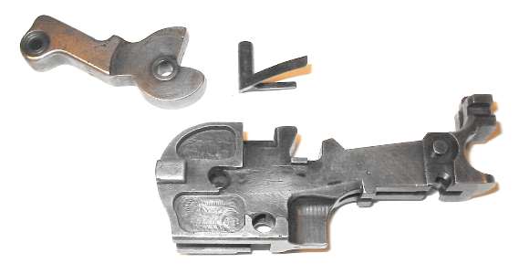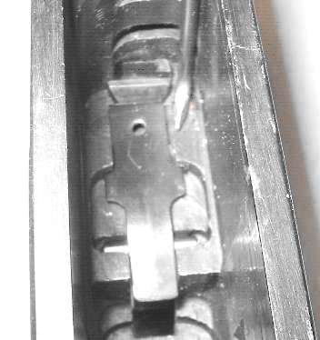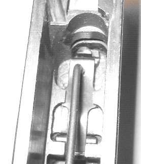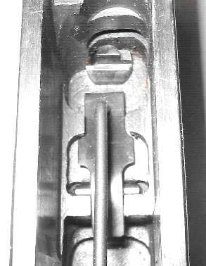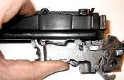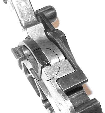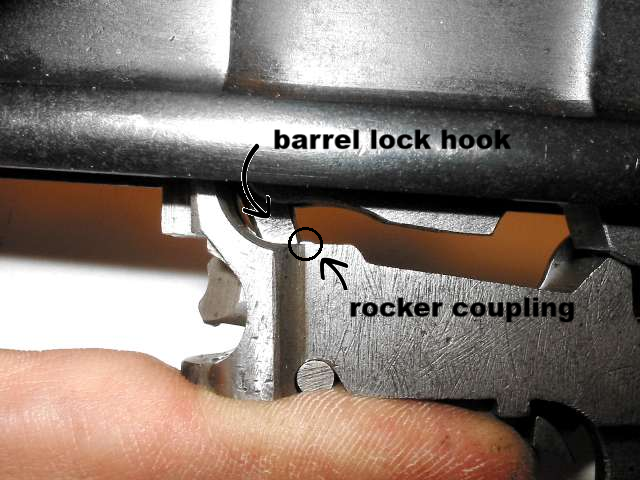 When the gun is assembled, the hook on the front of the bolt lock (circled in the photo) must catch on the top of the rocker coupling (also circled).