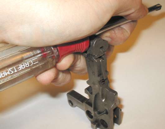 Put enough pressure on the bolt stop to hold it in place, but not so much that the screwdriver can't move. Pull the screwdriver out. Note that a flat blade screwdriver with a blade which is flat the whole length, such as the one I'm using in the photo, is ideal.