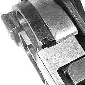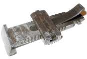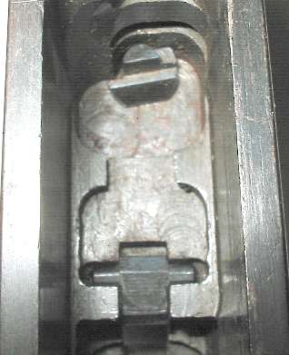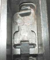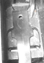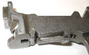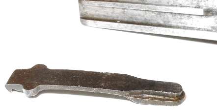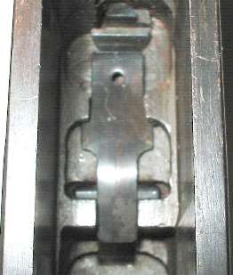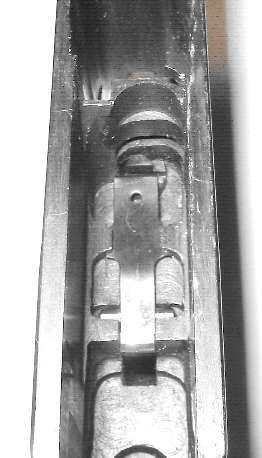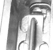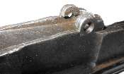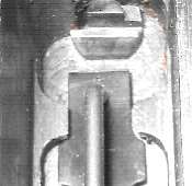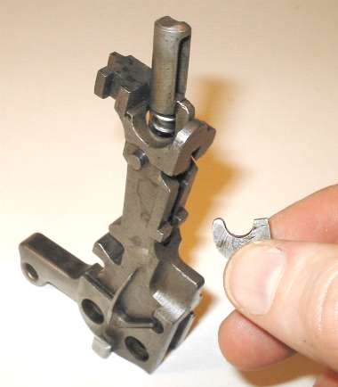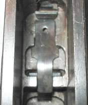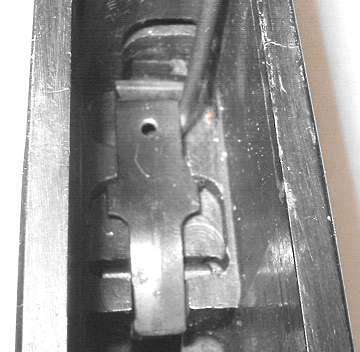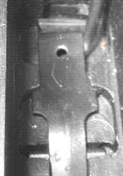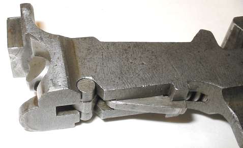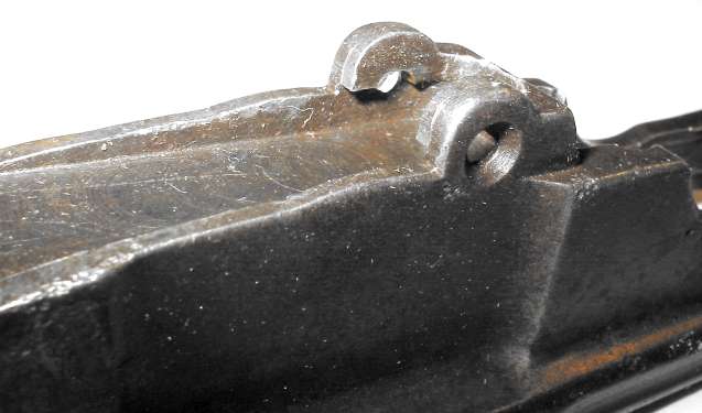 The tangent sight is by far the most difficult part of the gun to remove. The sight leaf on a Cone Hammer or early Large Ring Hammer pivots on a pin. All later tangent sight leaves pivot on lugs machined as part of the leaf. To disassemble, push downward against the sight spring - a strong leaf spring - then push/pull the sight leaf aft to remove. Here is the pivot. The little lugs on the sight leaf have to be pushed down into those cutaways visible under the pivot holes.