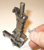Pull the rocker plunger, mainspring, and mainspring plunger out forward. On occasion, the mainspring plunger won't go forward, because the head of the plunger is mushroomed very slightly due to long use. In that case, pull the mainspring out forward, and let the plunger drop out backward once the hammer is out.