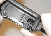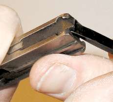 Note that the two screwdrivers shown above are not the same. The one used to push the recoil spring in is relatively wide and nice and square on the edges. The one used to rotate the firing pin is narrower, so that it will fit in the end of the firing pin. Instead of a narrow blade, one with the edges rounded off works well too, but it is harder to push the recoil spring in with rounded edges.