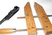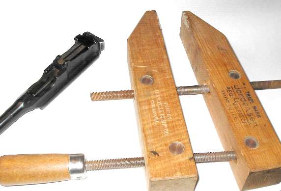 I take sight leaves off by hand, without tools. But until you learn how to do it, give yourself a break and use a clamp. A 10 inch handscrew, as shown, is a good type of clamp for this. Handscrews are commonly used in woodworking shops. Use the clamp to push the sight leaf downward and compress the sight spring.