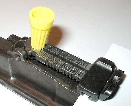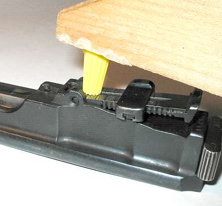 Put the barrel assembly close to the edge of a table or workbench. Put some sort of spacer on top of the sight leaf, in the position shown. For a spacer I'm using a plastic wire nut, of the type used in electrical wiring. Just about anything of the right size will do. Plastic is good as it's less likely to scratch anything.