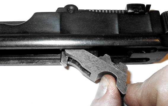 Use the sight slider to raise the sight leaf a bit. The aft end of the sight leaf has to be high enough to clear the top of the barrel extension when the sight leaf is slid back.