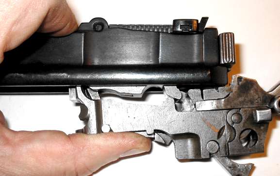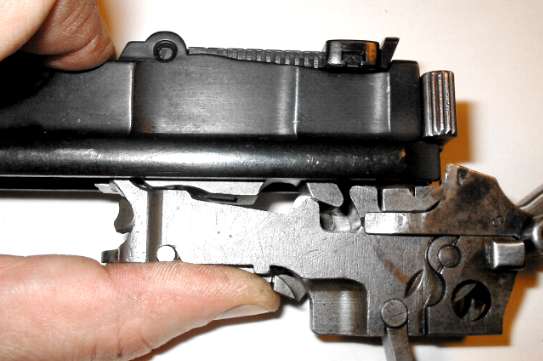 The hammer must be cocked as shown or the gun won't go together. When the hammer is down, it locks the takedown latch, preventing the gun from being assembled or disassembled.