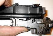 Watch out for the disconnector (441 in the photo) on the right-hand side, as it may try to get loose, especially if the gun is a bit worn. If the disconnector sticks out slightly the assembly may be hard to slide into the frame. Push it back where it belongs and all should be well.