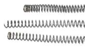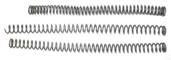 Here are a few sample recoil springs. The one at the top is very old and tired, and is really too short to reuse. The proper length is about 4.37 inches (111 mm) free (uncompressed) length. Original springs had two squared and ground ends. Some replacements don't have squared ends, but are just spring coils cut to length. The middle spring in the photo has one square end and one cut end.