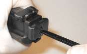 Squeeze the sight slider button, and slide the sight slider onto the sight leaf.