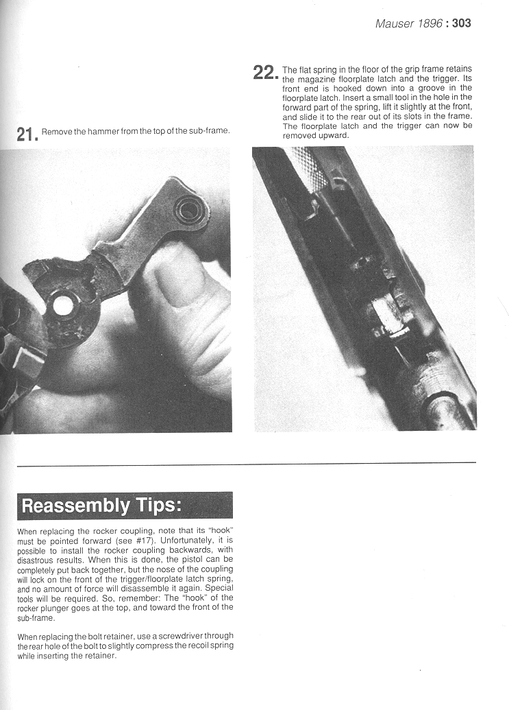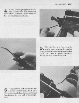 This is my scan of page 303 of The Gun Digest Book of FIREARMS ASSEMBLY/DISASSEMBLY Part I: Automatic Pistols, Revised Edition, by J. B. Wood (DBI Books, 1990). In the note at bottom, Wood notes a problem if the rocker coupling is installed backwards. I have tried to test this, but have never been able to assemble the gun with the rocker coupling in the wrong position. Whatever position I try, the coupling either falls out spontaneously, or the gun won't go together at all. However, someone with talents I apparently lack may be able to do it, and will then want to proceed to .... another J. B. Wood book, Gunsmithing: The Tricks of the Trade (DBI Books, 1982, currently out of print), for the fix -