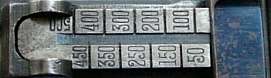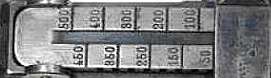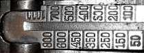 The first and last specimens shown above are separated by some 36 years and nearly 900,000 guns. But obviously there wasn't much change over this interval. The only visible detail variation is that somewhere around the middle of Prewar Commercial production, between serial numbers 104441 and 231741, a small downward blip appeared just aft of the pivot ears. It seems to have had no effect whatever on the sight elevation. Both 104441 and 231741 have "900" sights, so the blip had nothing to do with the deletion of the 900 meter range. The blip persisted until the middle of M-30 production, after which it seemed to return intermittently. What all that can mean is a mystery. Stable Production Period sight leaf markings Even during the relatively sedate Stable Production Period, the sights underwent a surprisingly energetic, and apparently pointless, evolution. There were six different layouts of range numbers, which for convenience I have labeled a through f. There are tiny variants of each layout. I believe that these tiny variants were caused by differences in screens used to prepare the lines and numbers for etching. Each layout had from one to four variants. "Earliest appearance" and "Latest appearance", below, are just serial numbers of guns I happen to have seen. All of these 50 to 1000 sight leaves were lug pivot types. Pin pivot sight leaves, already obsolescent by the start of Large Ring Hammer production, had finally gone extinct in the Flatside era.