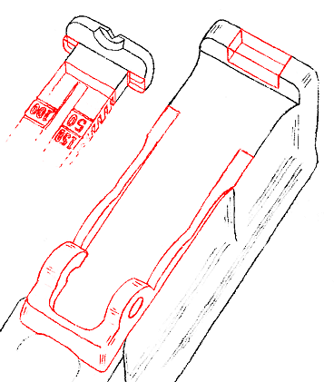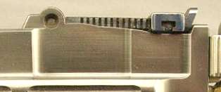 The older sight leaf had 15 range marks, and 15 slots cut in the left edge of the leaf. The sight slider button locked in any of these 15 slots to hold the slider in place and select the range to the target. The newer sight leaf had only 14 range marks. It still had 15 slots. But the sight slide would only lock in 14 positions. How did Mauser work that trick? Disassembly of the sight reveals all. Here are the left edges of the two sight leaves, earlier above, later below.