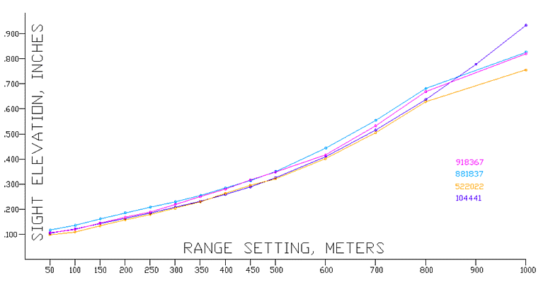 A small number of Prewar Commercial guns were chambered for this cartridge. The first C-96 so chambered appeared about 1908, and others popped up sporadically until 1914. The case was straight walled, the same length as the 7.63mm case (.980 inches), or .230 inches longer than the 9x19mm Luger case. The muzzle velocity of the cartridge as loaded by D.W.M. was something on the order of 1360 feet per second, very close to the velocity of the 7.63mm cartridge. With similar velocities, the ballistic trajectories of the two bullets would be similar, so guns chambered in 9mm Export had exactly the same sights and ramps as their 7.63mm sisters. [Memo to self - The reasoning seems sound, but it would still be a good idea to check this a bit more thoroughly with some real measurements] The missing 900 meter range mark When the 900 meter range mark was deleted, the ramp curve was unaltered. The only effect was to lower the V notch in the sight leaf by about 0.15 inches when the slider was set at 1000 meters. Considering the inevitable bullet spread at 1000 meters, it's hard to imagine that anyone noticed any change in practice. This graph shows the effect on sight elevation, as measured on serial numbers 104441 (a Prewar Commercial with a 900 sight leaf), 522022 (a Postwar Bolo with no 900), and two M-30s.