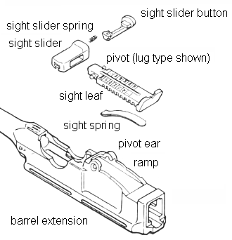 "Grooved" sight This was an odd variant which seems to have appeared only on some Prewar Bolos in the 402xx to 405xx range, some of them Large Ring Hammers, and some Small Ring Hammers. There is some evidence that it cropped up on a few Small Ring Hammer Carbines as well. The sight leaf had a groove running its full length, the sight slider had a wide trough cut out, and the top of the barrel extension, just forward of the sight leaf pivot, was notched. Also, although the range markings appear to be in the same positions as on the standard 50 to 1000 sight leaves, some (not all) had no 50 marked. What the function of these short-lived modifications might have been is a mystery.