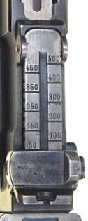 ← The ramp is unusual, too. The overall shape is somewhat like the bimodal curve ramp which became standard some seventeen thousand guns later, though of course it doesn't have the break in the smooth curve which defines the bimodal curve ramp. One would expect there to be such a break, as this sight has mixed 50 and 100 meter range intervals (or perhaps even 25 meter intervals). There should be a break since the range intervals for 50 and 100 meters are at equal spacing on the sight leaf, requiring two different ramp curves, and in general the two won't meet gracefully.