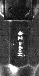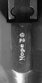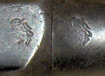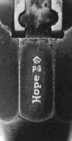 It looks like the order of the stamps in the triad changed, also. I see at left the Admission to Proof mark (the saltire couped with shield and helmet), then the final proof (the P-bomb), and finally at right the year code. That year code could be an X, which would be 1952. According to the Astra production figures, serial 34319 was probably made in 1951. In the world of Astra, that counts as pretty solid confirmation. An Almost-Proof? The mysterious Hope stamp, which appeared on the barrel or top chamber flat of the earliest Model 500s - up to serial number 500 or so - was accompanied by what certainly looks like a proof mark - a B G surmounted by a crown. Here are photos of three different guns (one photo each from Erickson & Pate, Antaris, and