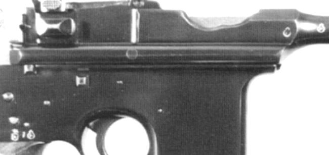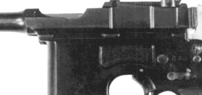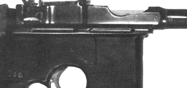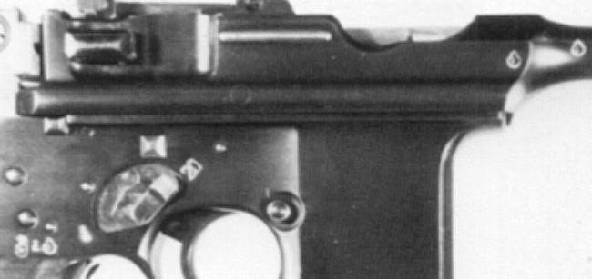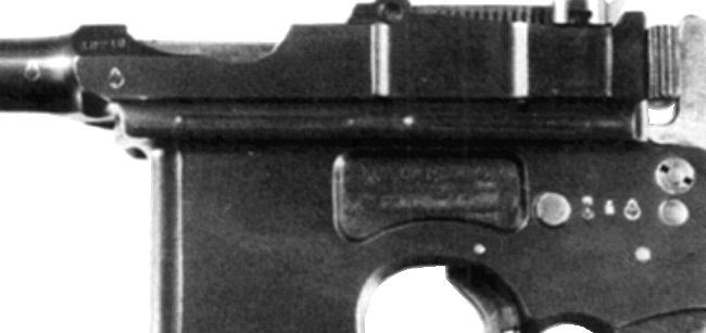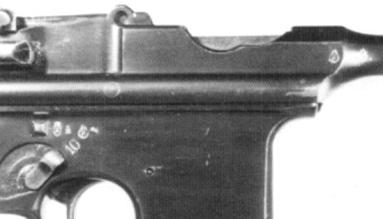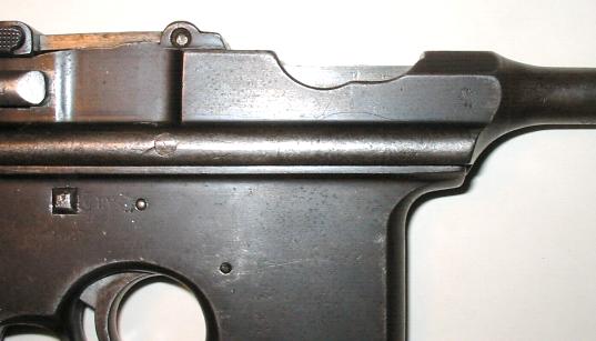This Model 903, serial 26760, has the selector switch (as it should). Somebody decided to avoid the switch area altogether by stamping the triad down just over the grip. The late single proofs on the barrel and extension were left in the normal places.