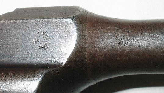 We can't say for sure that that's the early triad on there unless we can figure out if the illegible figure is the familiar lion rampant. Fortunately, the single proofs show clearly on the barrel and extension of this gun, and since we know they're the same as the third stamp of the triad, we can be certain that it is indeed the standard early triad.