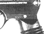 Yes, they're different guns, all right, not just different photos of the same gun. But to me all three Hopes, including the wannabee proof, look identical. That means that the text of Hope and the wannabee proof were on the same stamp, or die, or silkscreen, or whatever Unceta used to put it there. So unless the word "Hope" was part of the proof mark (not too likely - the whole idea of a "proof" is, by actual test, to prove that the gun won't blow up, not to hope that it doesn't), the mysterious crowned B G isn't a proof mark. Proofs on Beistegui Hermanos guns Documentation (meaning, mainly, photos) is slim on this topic. The guns were indeed proofed, and with the same single proofs and triads we've just seen all over the Unceta product. However, locations were a different. Based on a limited number of samples, I'd say that the First Model guns were stamped on their left sides. Second and Third Model guns were stamped on their right sides, with the triads just above the grips. This first example is from E&P, page 214, where it is captioned "Royal". But it is clearly marked ETAI on the right side of the frame, and not marked Royal at all. This is one of the First Model Beistegui pistols, an early (semi-auto only) variant. But it can't be too early, as we can see the later style single proofs (the "P" bomb) on the barrel and barrel extension, and the later triad on the frame. Although it would take a genuine man of faith to be sure of the proof year in the fuzzy photo, it could be a B, for a proof date of 1928. That would be consistent with the serial number of this gun, 12713 (maybe), which would make us suspect that she was made in 1928. The proof stamps are all on the left side of this gun.