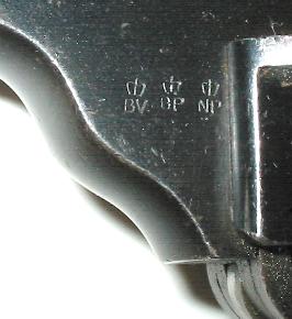 My word, things can get crowded down there. Here's a fairly late Model 900, serial 29096, with a late triad (as expected) over the grip (as expected), but there are some other stamps too - some sort of crossed scepters with three letters at left, and a circled BV at the top edge - Birmingham View proof?