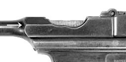 The magazine catch worked much like that on the American 1911 service pistol - a pushbutton extended across the frame, and at the far end had a small tooth or hook which caught in a slot in the magazine sidewall. The Astra pushbutton was on the right and the slot was on the left side of the magazine, a mirror image of the 1911 arrangement, but the basic idea was the same. The Schnellfeuer magazine catch caught a small projection on the aft face of the magazine housing, and so didn't need to extend all the way across to the far side of the frame.