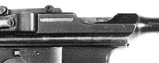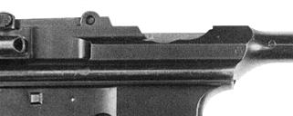 On the right side, the new wider side chamber flat extended further aft. The extended area enclosed a bolt catch mechanism, so that the bolt would be held open after the last shot without resting on the magazine follower. Without such a holdopen mechanism, it can be a real chore to pull an empty magazine out. The C-96 and the Spanish semi-autos used the cartridge follower as a holdopen. That was a radical idea in pistol design when it appeared in 1896 (although old hat on rifles), but it's fairly useless in a gun with a removable box magazine. The new catch latched into a groove in the bolt, just visible in this photo of a very late specimen, serial 31808 -