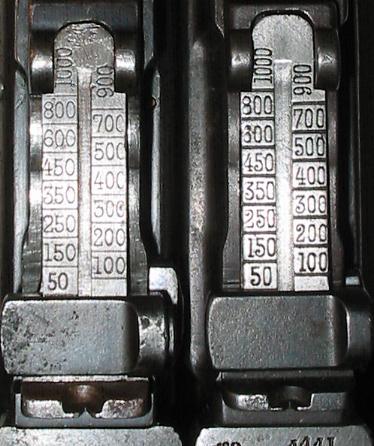 The Astra tangent sight was almost identical to the earlier Mauser Prewar Commercial tangent sight, with the "900" range. The Astra sight retained the "900" which Mauser had dropped in the later Prewar Commercial days. Interestingly, while the numbers on the Astra sight still vary slightly, giving them that handmade look, they're slightly more regular than the Mauser numbers. During M-30 production Mauser would change to numbers made by a different process, and the handmade look would disappear. See the Sights page for the ugly details of Mauser sight leaf evolution.