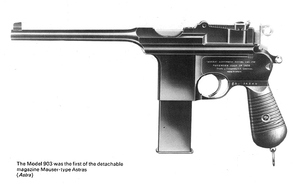 Encouraged by the extraordinary success of our Pistol <<ASTRA 902>> due to its characteristic advantages of, <<LONG SHOOTING RANGE>>, <<ACCURACY>>, <<RESISTANCE>>, <<REDUCED WEIGHT AND SIZE>>, we constructed the new and improved <<ASTRA 903>>, which embodies the same features with the additional novelty of alternative methods of loading per clip and per detachable magazine. [etc.]