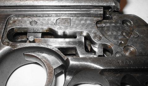 This model was designed to meet an order for 1000 pistols for the Guardia Civil. Special requirements were chambering in the standard Spanish service cartridge, 9mm Largo; and a cyclic rate reducer. The Model F used the rate reducer which had been successfully tested on the Model 904, although its integration with the selector switch was a bit different. While still on the right side of the frame, the Model F selector switch was further aft than on the 901, 902, 903, and 904, sitting directly above the grip. As there was already a bunch of mechanism crammed inside there, Unceta didn't mill the recess for the switch, as in the other select-fire models. Instead, the switch was entirely outside the frame, hanging out in the breeze. Lacking a milled recess to limit switch travel, stops had to be added. So the pin which ran through the frame just above the grip (which we saw on the Model 904) was extended out slightly on the right side, and did double duty as a stop for the selector switch when in the semi-auto setting. The switch stop at the full auto setting was a slightly lengthened sear pin. The switch was marked T (for tiro, "shot", apparently meant to be an abbreviation for tiro a tiro, "shot to shot" - still none too clear) and A (for ametralladora, "machine gun") at the semi- and full auto settings.