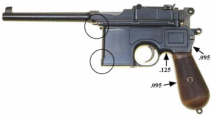The two are almost identical in overall outline. The Prewar Commercial grip is very slightly narrower, and extends slightly higher into the frame area. So the Astra grip is slightly fatter (front-to-back) and stubbier. The dimensional differences are shown in inches, and are approximate (certainly not accurate to the implied .001"). The major outline difference between the two is the curved section at the top of the Astra magazine, which is entirely missing on the Mauser product (the upper circled area). That curved bit is very prominent, and visible from a distance - perhaps the easiest way to identify the Astra in photographs. It is also the reason why Astra 900s don't fit well in shoulder stock holsters made for full-sized Mausers. The front of the magazine of all 900 Series guns is straight, lacking the slight swelling at the bottom (the lower circled area) seen on all C-96 variants except the Schnellfeuer. The Astra looks relatively top-heavy, as the barrel extension is a bit taller top-to-bottom (and the frame slightly shorter in the same direction). The Astra is bulkier around the chamber area -